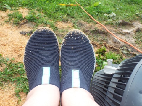 Saw dust on Marie's shoes |