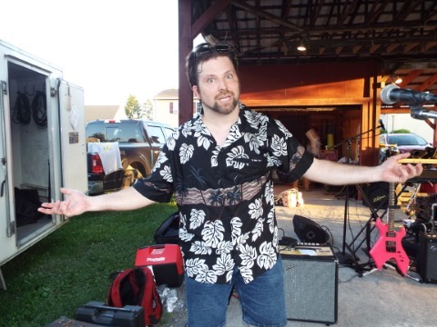 Gumby, feeling under the weather, gets a visit to his car from Dave before the show |